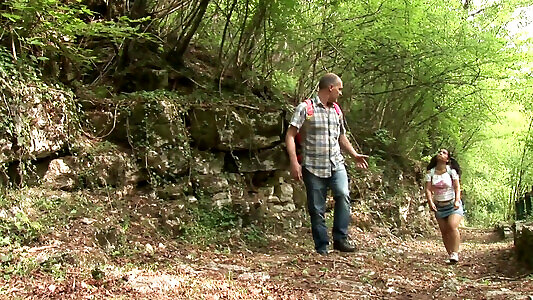 Old trainer misuse of a young hiker in the woods