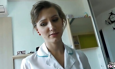 Nurse cutie with braided ponytails blows and bones a patient