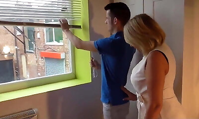 белокурая толстушка соблазнила молодого человека своими огромными сиськами и засунула его твердый стояк в свою нуждающуюся пизду
