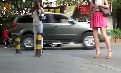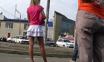 Hot honey in a brief white dress exposed by an up skirt voyeur