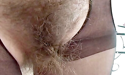 Brunette with hairy pussy fucks in milky stockings